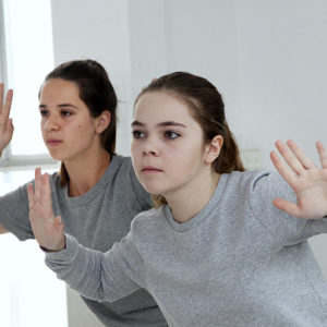 Sabine Hass verschwindet hinter dem Vorhang und drückt den Knopf. Wumm! Kräftige Beats füllen den Saal bis unters Dach. Die Musik macht wach. Acht junge Frauen, die eben noch auf dem Sofa lümmelten, strecken ihr Rückgrat und spannen die Muskeln an. Dann lassen sie sich ergreifen von der Kraft der Musik. Die Choreografie sitzt.