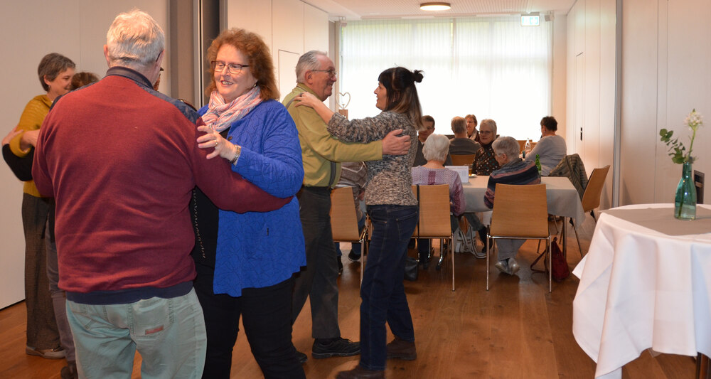 Irène Taimako: Für Menschen mit einer Demenz sind das öffentliche Leben, das Umfeld und die Gesellschaft eine grosse Herausforderung. Die Gefahr besteht, dass sich Menschen mit einer Alzheimer-Erkrankung mehr und mehr aus der Öffentlichkeit zurückziehen. Die Gründe dafür sind vielfältig. Ein zentrales Thema ist jedoch der Umgang mit der Schnelligkeit und dem «Hopphopp» in der Gesellschaft. Für Menschen mit einer Demenz sind Gespräche und Fragen häufig zu schnell, dann fühlen sich die Betroffenen unverstanden oder übergangen. Darum ist uns bei den Treffen hier wichtig, dass wir das Tempo in Gesprächen anpassen. Der Rahmen des Alzheimer-Cafés bleibt immer gleich, das schafft Orientierung. Wenn Sie einem Menschen mit einer Demenzerkrankung begegnen, freuen Sie sich und sprechen Sie nicht zu schnell. Die Kommunikation mit dem Gegenüber soll einfach sein, in kurzen Sätzen und mit einem freundlichen Blickkontakt. Während des Alzheimer-Cafés umrahmt ein Akkordeonist die Veranstaltung. Wer mag und kann, schwingt das Tanzbein.