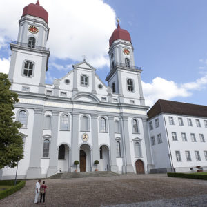 Vor dem Hochaltar der Kirche führt eine Türe zum Konventgebäude. Auf dem kürzesten Weg hinaus aus der Klosteranlage passiert Bernhard Minder wie zufällig weitere Schmuckstücke der Barockkunst. Die Sakristei mit einem wertvollen Gewand von Abt Malachias, die Bibliothek mit den geschnitzten Eichensäulen, den grössten barocken Festsaal der Schweiz und das Treppenhaus, welches durch die Anordnung der Treppen einen ganz speziellen Raumeindruck vermittelt. Dann geht’s hinaus in den Park.