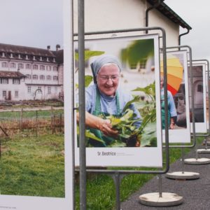 Das Resultat von Christophs Hammers Arbeit konnten die Besucherinnen und Besucher am vergangenen Samstag im Klosterhof betrachten. Auf grossen Plakatständern fanden sich Porträts der interviewten Fahrer Schwestern ebenso wie Eindrücke aus dem Alltag, die zugleich die prägenden Themen der Gemeinschaft umreissen: Gastfreundschaft, Garten, Handweberei, Kunsthandwerk, Backstube, aber auch Fitness oder Lebensfreude.