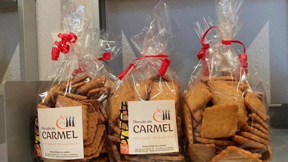 Eine Strasse windet sich durchs Dorf hinauf. Dort, wo sie hinter dem Hügel verschwindet, liegt das Monastère du Carmel. Zwölf Ordensschwestern des Karmeliterordens leben, beten und arbeiten hier. In der klostereigenen Backstube entstehen die Biscuits du Carmel, mit denen die Schwestern Abnehmer in der Westschweiz beliefern und so einen Teil ihres Auskommens bestreiten. In den letzten Wochen ging es in der Backstube besonders geschäftig zu und her. Die Teigproduktion läuft auf Hochtouren, fürs Ausstechen und Formen braucht es zeitweise die ganze Gemeinschaft. Auf grossen Blechen ziehen die Schwestern die frischen Sablés, Haselnussmakronen und Spitzbuben aus dem Ofen. Dieser Tage laden sie die kostbare Fracht in einen Lieferwagen und fahren damit nach Zürich.