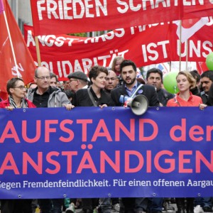 «Wir hatten mit tausend Leuten gerechnet. Es ist überwältigend, dass es jetzt über dreitausend sind», sagt Cédric Wermuth, Co-Präsident der SP Aargau. Die hohe Teilnehmerzahl ist ein starkes Zeichen in einem Kanton, der in den letzten Jahren meist wegen Protesten gegen Asylunterkünfte Schlagzeilen machte; beispielsweise in Aarburg, Bettwil, Bremgarten oder aktuell in Oberwil-Lieli.  «Die Asylpolitik spaltet den Aargau», titelte der Tagesanzeiger im August 2014. «Heute zeigen wir das andere Gesicht des Aargau», stellt Cédric Wermuth zufrieden fest. Und dieses Gesicht ist bunt und vielfältig, vereint Organisationen, die in Einzelfragen vielleicht sonst weniger kooperieren: christliche Kirchen und Pfarrgemeinden, Gewerkschaften, Jugendorganisationen, Parteien, Hilfswerke, Frauenorganisationen, integrative Vereine, Kulturschaffende, die jüdische Kultusgemeinde Endingen, der Verband Aargauer Muslime: Die Liste der beteiligten Organisationen ist lang. Entsprechend lang war auch der Demonstrationszug. Rund eine Stunde zogen Menschen mit Ballons und Fahnen durch Aarau; es wurde gelacht, geredet und musiziert, vereinzelt erklangen Sprechchöre gegen Fremdenfeindlichkeit.