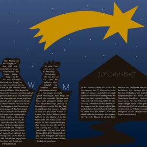 20*C+M+B+17 schreiben oder kleben die Sternsinger über oder an die Türen der Häuser. Es ist eine Kombination aus Jahreszahl, dem Stern von Bethlehem, drei Kreuzen als Zeichen für den dreifaltigen Gott und den Anfangsbuchstaben der Worte «Christus Mansionem Benedicat» – Christus segne dieses Haus. Dass die Schweizer Sternsinger-Gruppe aus St. Gallen zum Jahresbeginn 2017 an der Neujahrsmesse mit Papst Franzsikus teilnehmen konnte, mag andere Kinder begeistern und dazu beitragen, dass die Solidaritätsaktion weiterhin wächst.