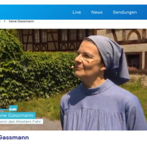 «Die Kirche kann nur gesunden und erstarken, wenn Frauen und Männer gleichberechtigt miteinander in die Zukunft gehen». Irene Gassmann setzt sich seit Jahren dafür ein, dass beide Geschlechter in der Kirche gleich- und vollwertige Mitglieder werden. Regelmässig wird im Benediktiner-Kloster Fahr speziell dafür gebetet, so der Anreisser zum Telezüri – Sommertalk mit Priorin Irene Gassmann auf der Homepage des Senders. In unterhaltsamen 25 Minuten erzählt Priorin Irene Gassmann vom Klosteralltag und ihrem ersten Gang zur Pforte.