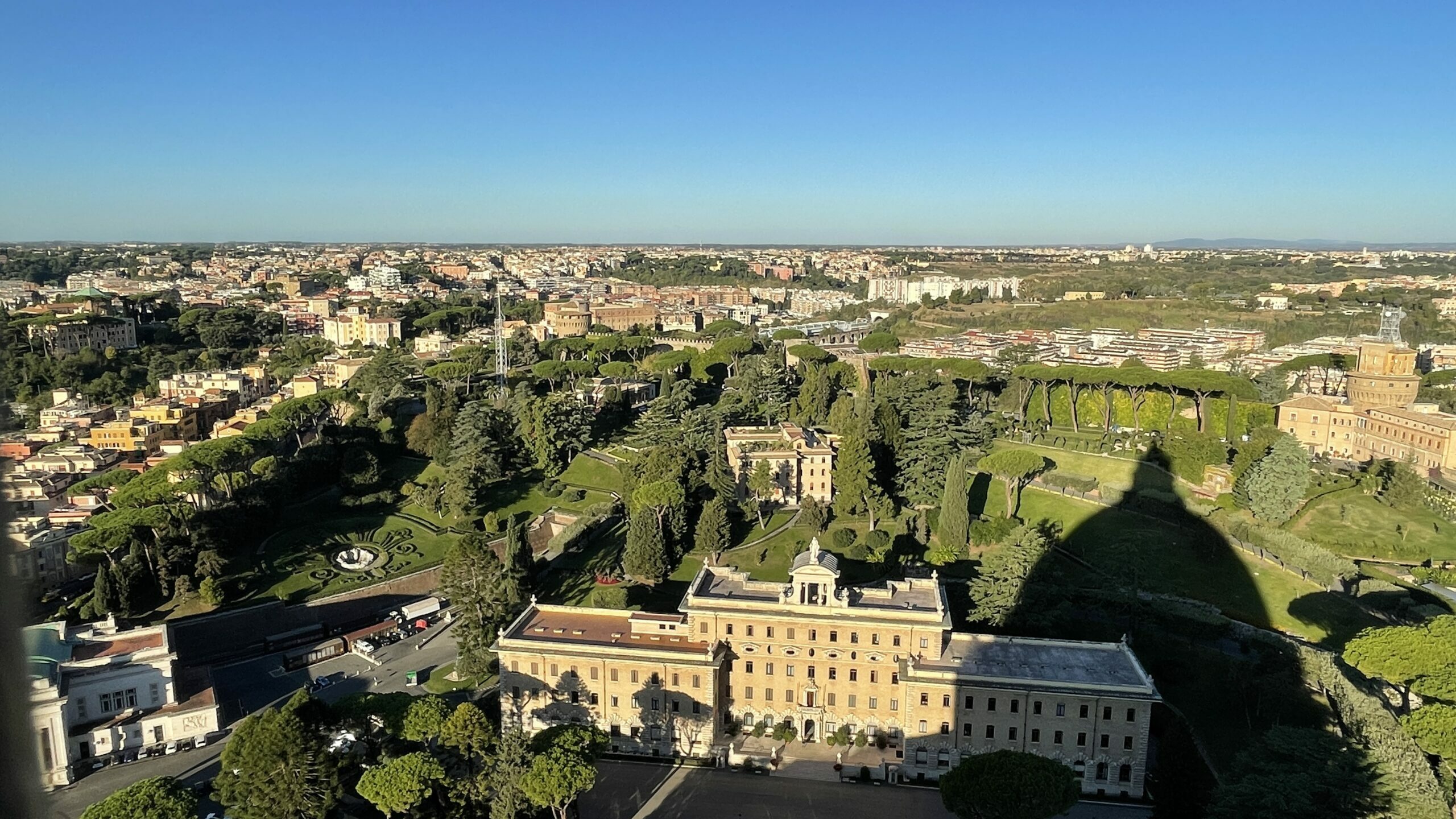 So steht das Reisegrüppchen morgens kurz nach Acht auf dem leeren Petersplatz. 551 Treppenstufen erwarten die Frühaufsteher. Die Aussicht von der Kuppel auf die Stadt und die Vatikanischen Gärten ist grandios.