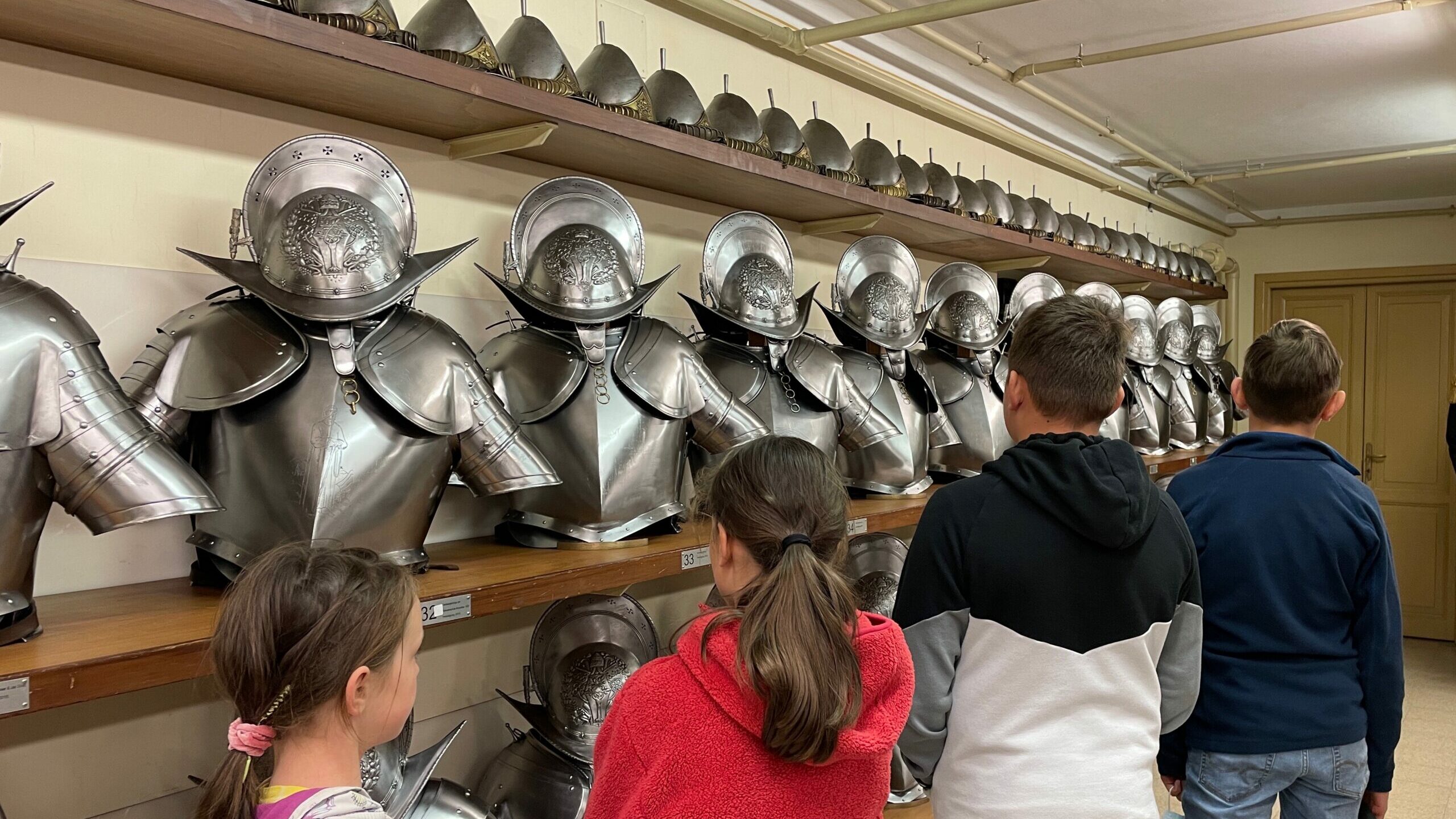 Der Besuch in der Waffenkammer wurde von den jungen Romreisenden mit Spannung erwartet. Sie interessieren sich zwar für die kostbar geschmiedeten Brustpanzer und Helme, fragen aber auch kritisch nach, ob die Gardisten im Notfall weitere Waffen zur Verteidigung hätten. Wieder draussen im Hof instruiert Hellebardier Hüging die Kinder in der richtigen Haltung beim Wachestehen: Arm auf Schulterhöhe, Beine schulterbreit, die Hellebarde steht vor der Spitze des rechten Fusses. Die Kindern sind sich einig: unmöglich, zwei Stunden ohne Bewegung so zu stehen. Was, wenn es einen juckt? Wenn jemand etwas fragt? Wenn man lachen muss?