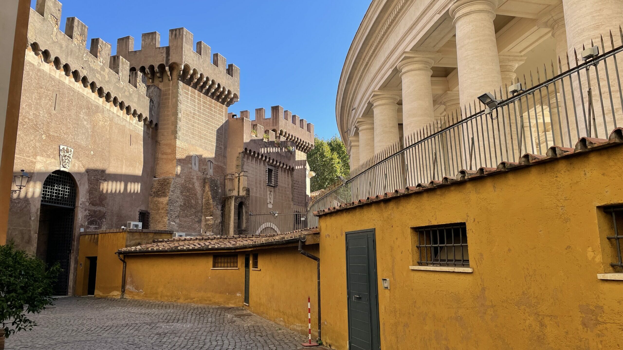 Mattieu Hüging deutet auf die Mauer, die den Innenhof zur Vatikanseite hin begrenzt. Sie ist ein Teil des Geheimganges, durch den Papst Clemens VII. geflohen war. Heute befänden sich hier die Zimmer einiger Schweizergardisten, verrät Hüging. Die Kinder fragen nach und erfahren, dass die Gardisten zu zweit oder zu dritt in einem Zimmer wohnen und alle Zimmer ein wenig anders aufgeteilt seien.